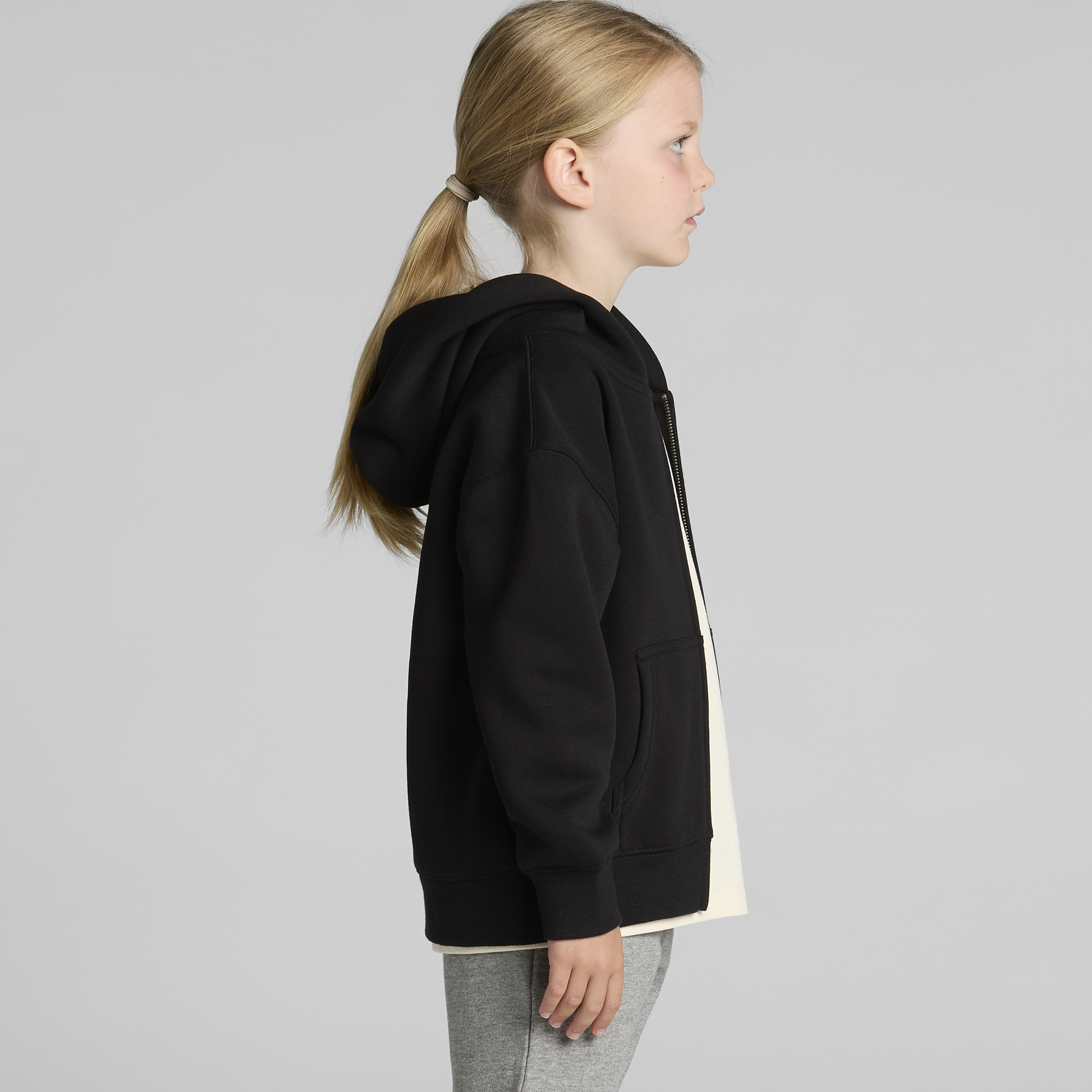 Construction: Zip hood, drop shoulder, kangaroo pocket, self-fabric lined hood, no drawcord, YKK zip, sleeve cuff ribbing